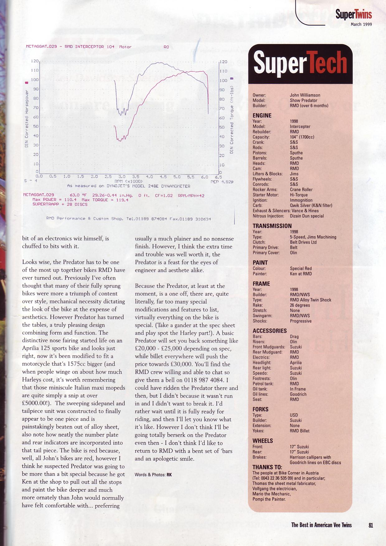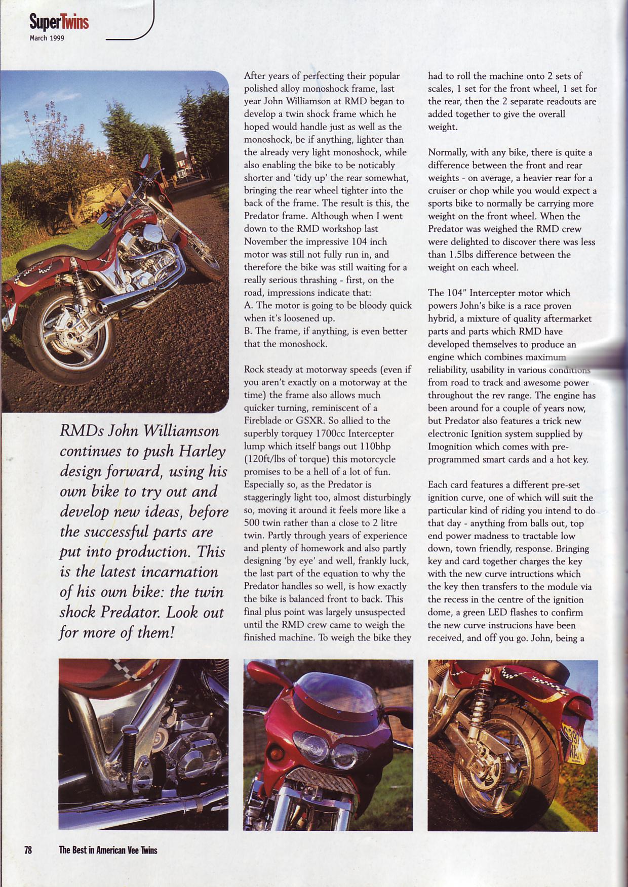 Famous english tuner John Williamson of RMD and his Predator with 104" Intercepter engine. Article text features a short introduction to the AMM-IMMOGNITION.