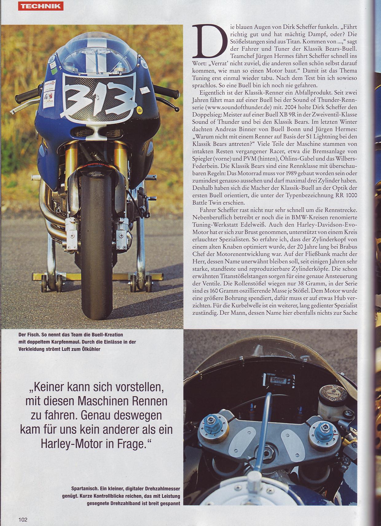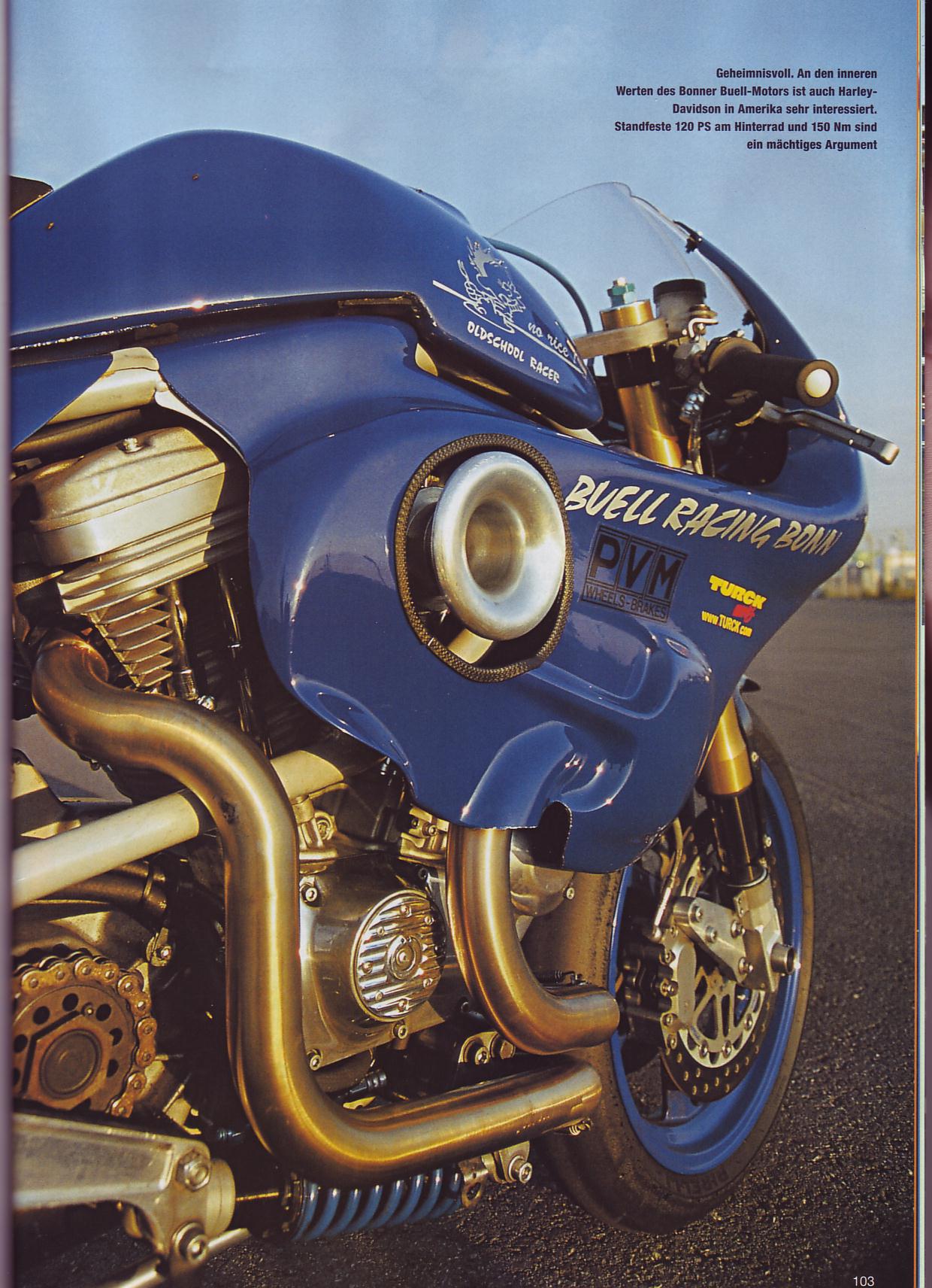 Driver Dirk Scheffer won every race in the whole season on this bike. Ducatis, BMWs, Guzzis, Yamahas were degraded to swallow dust and smoke of this 120 hp (rear wheel), 150Nm (rear wheel) classic Buell. The bike was assembled by Michael of HD-BUELL Bonn, who told me, that the engine not even gets hot during the race.