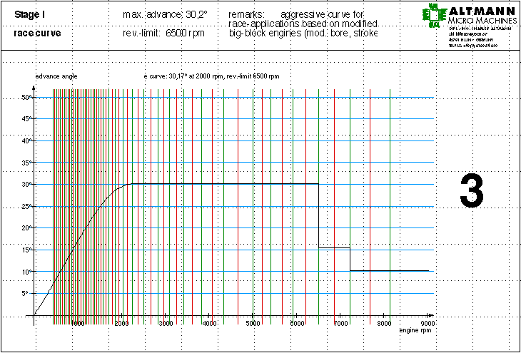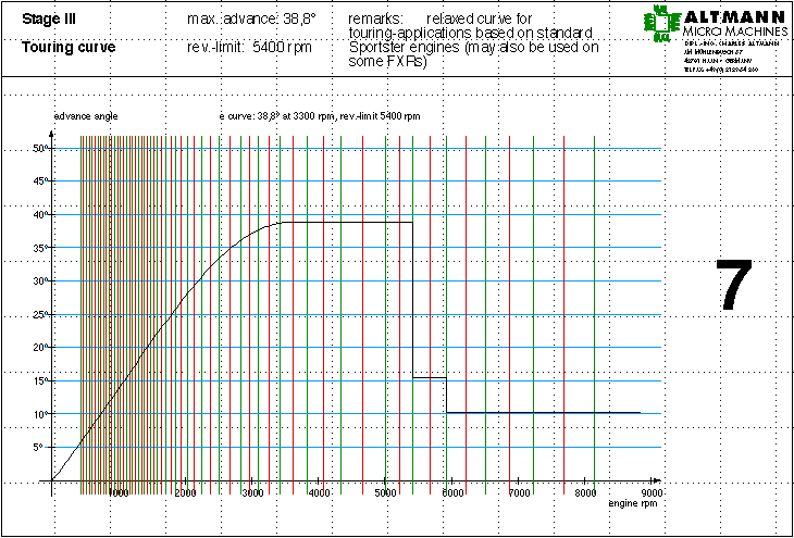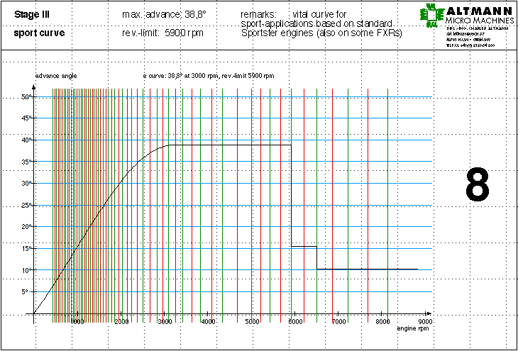 So: maximum advance is determined by the stage (30,2°, 34,5° oder 38,8°) and the low-rpm behaviour depends on the choice of a Touring/Sport/Race curve.